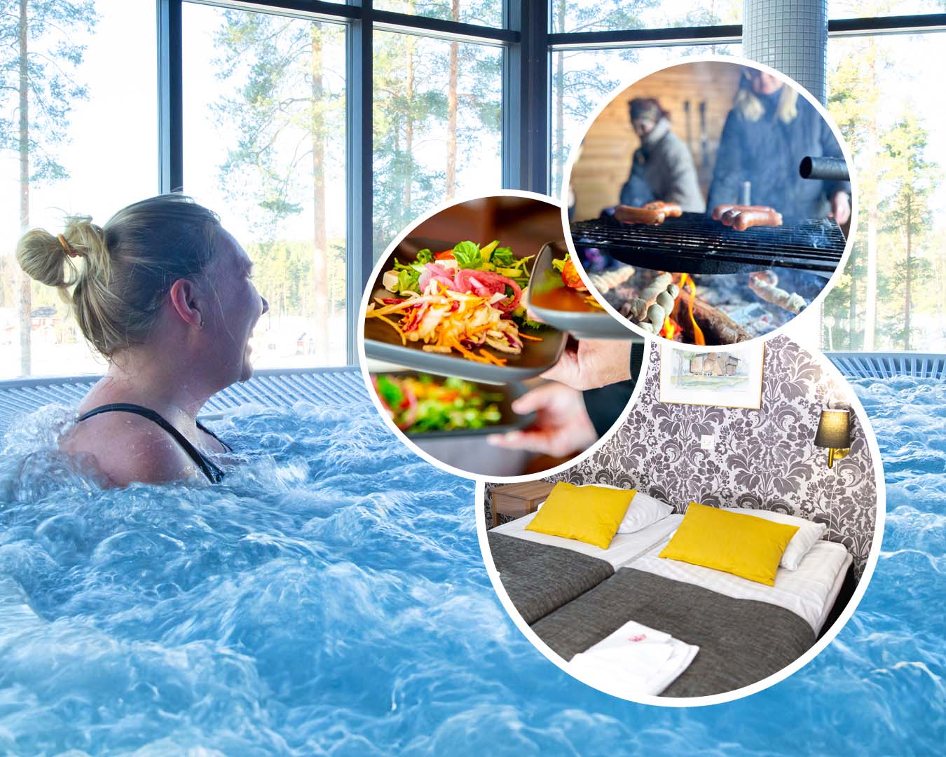 Siinä kaikki mitä tarvitset! Maittava illallinen ja hyvät yöunet viihtyisässä mökissä, ja heräät hieman onnellisempana.