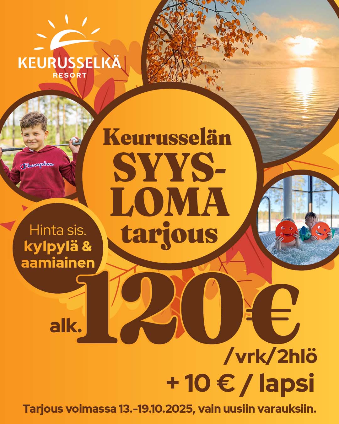 Keurusselkä Resort tarjoaa monipuoliset puitteet koko perheen yhteiseen syyslomaan. Tartu lomatarjouksiin ja saavu nauttimaan monipuolisesta lomaohjelmasta vieraanamme.